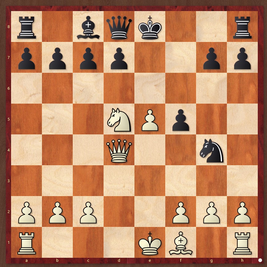 De partij begon scherp. Met een pionoffer op e6 dwong ik zijn f-pion tot actie, waardoor zijn koning in een open veld kwam te staan. Aanvalslijnen openden zich als rivieren die uitmondden in een zee van mogelijkheden. Na zestien zetten stond ik nog steeds een pion achter, maar de stelling glansde met een voordeel van +2,5 tot +3,0. Het was alsof ik een storm aan het opbouwen was, langzaam maar onafwendbaar.